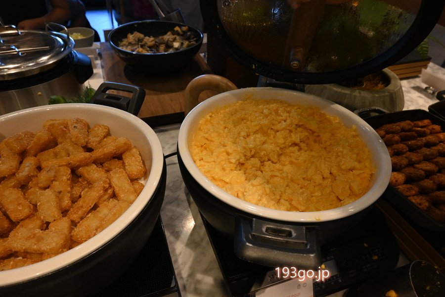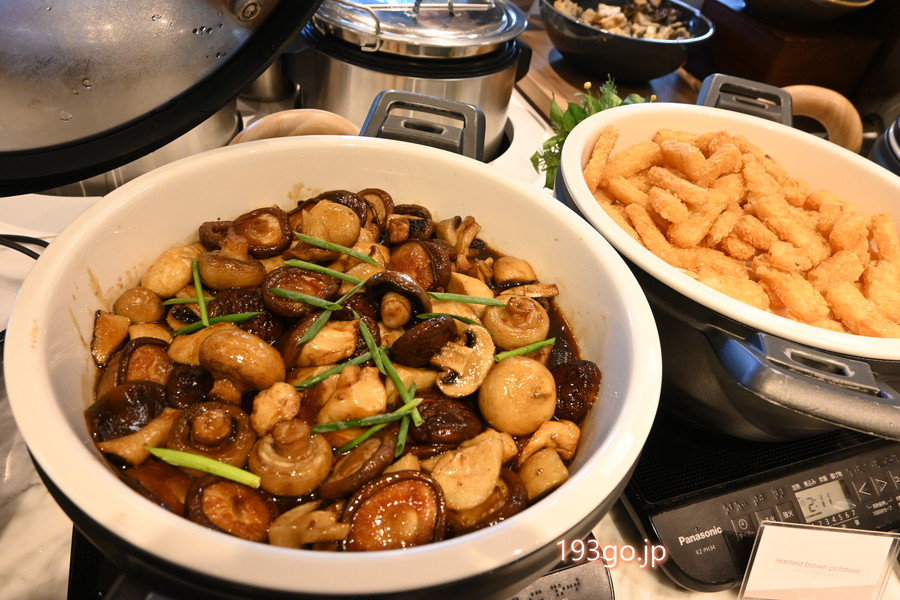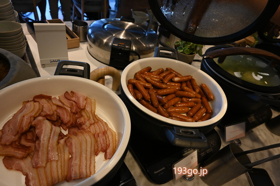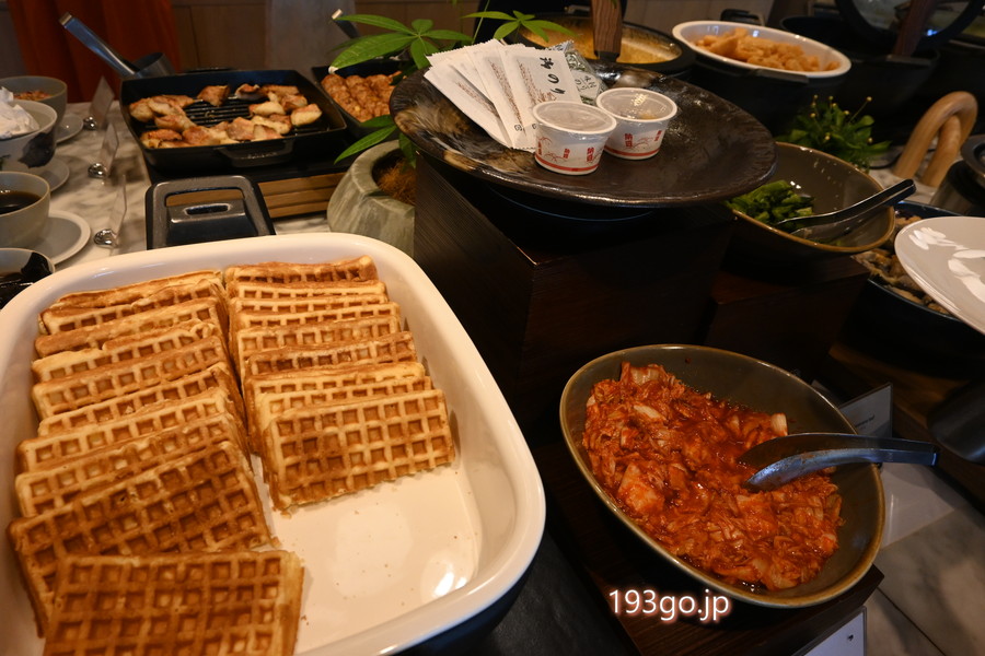 ブッフェ台にはベーコンやソーセージ、ワッフル、ポテト、キノコソテー、サラダ、各種パンなど、