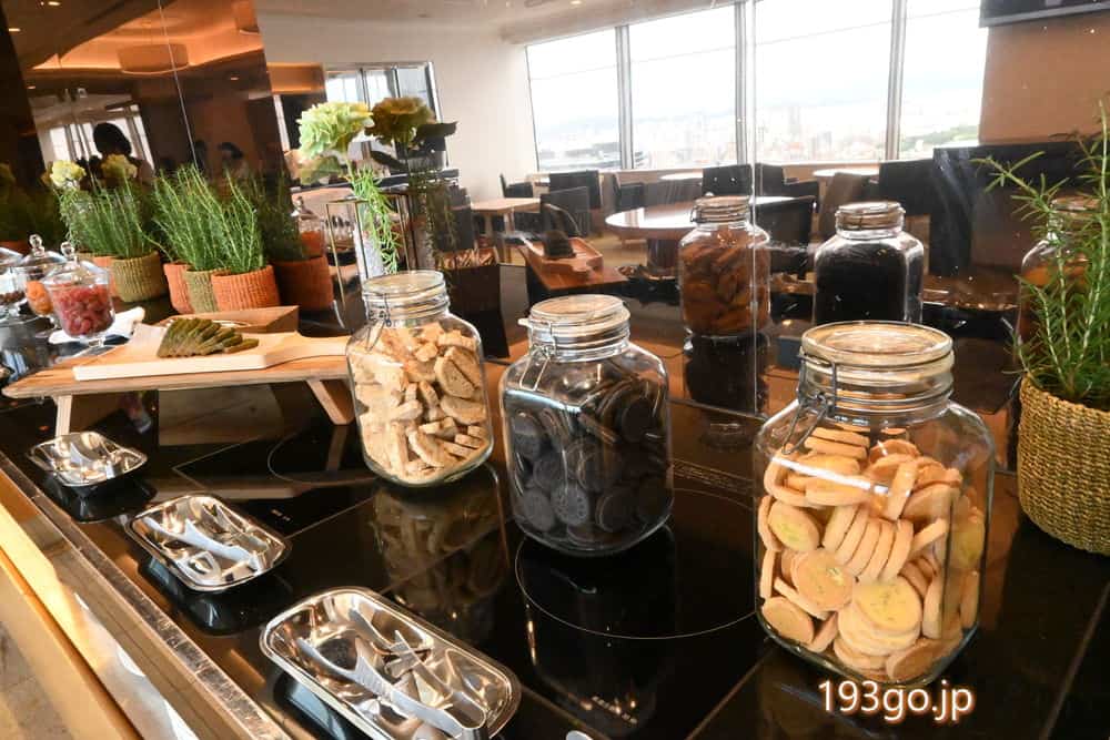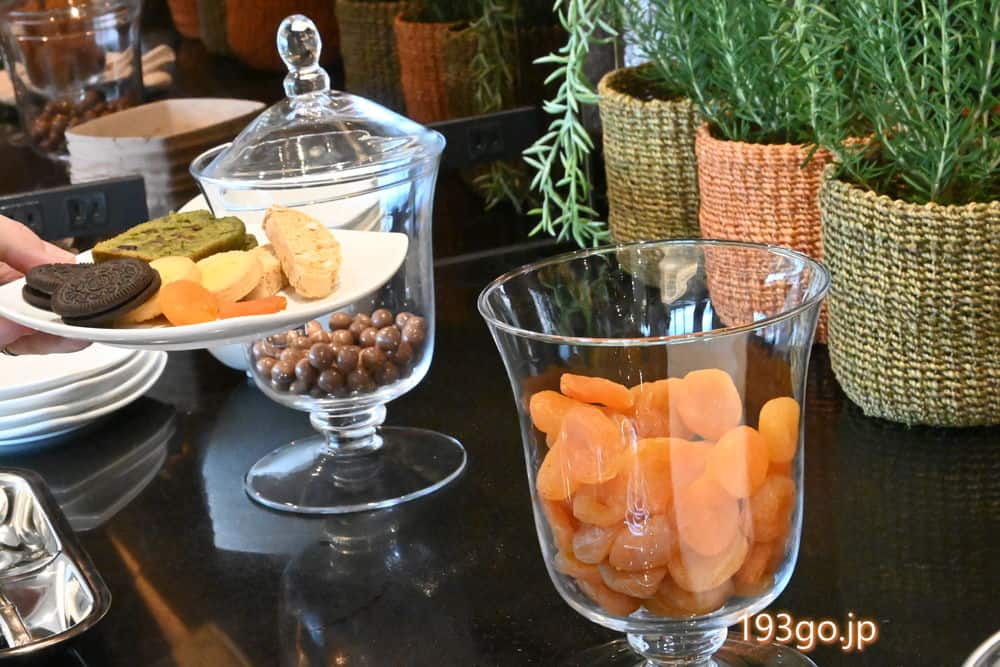 ティータイム(~17:00)には、クッキーやパウンドケーキ、ドライフルーツなどのスナック。