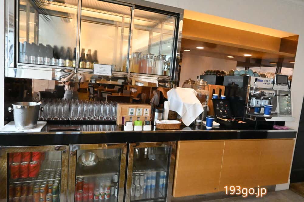 ドリンクステーションには、ソフトドリンクと、ネスプレッソのコーヒーマシン、ティーバッグ。