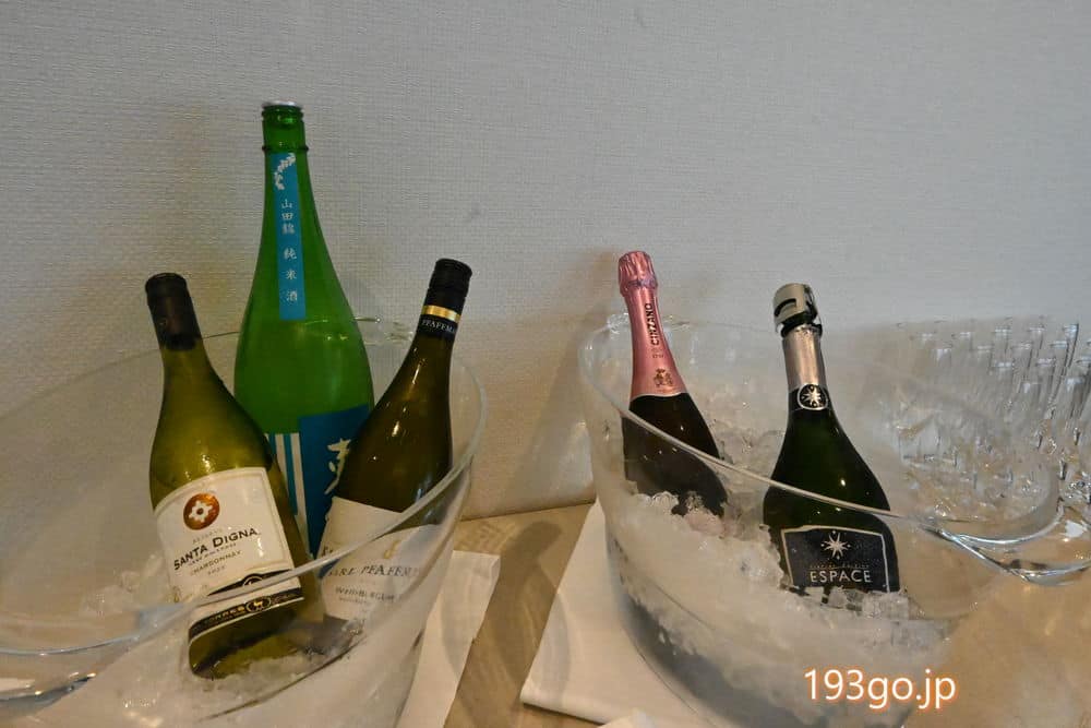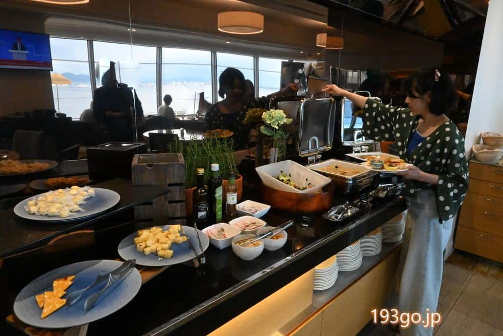 アルコールの提供がスタートし、お酒に合うおつまみも。ビュッフェ台から好きなものをピックアップ。