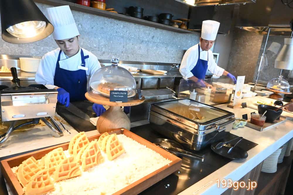 パンケーキやワッフル、目玉焼きも焼きたてが並べられた。