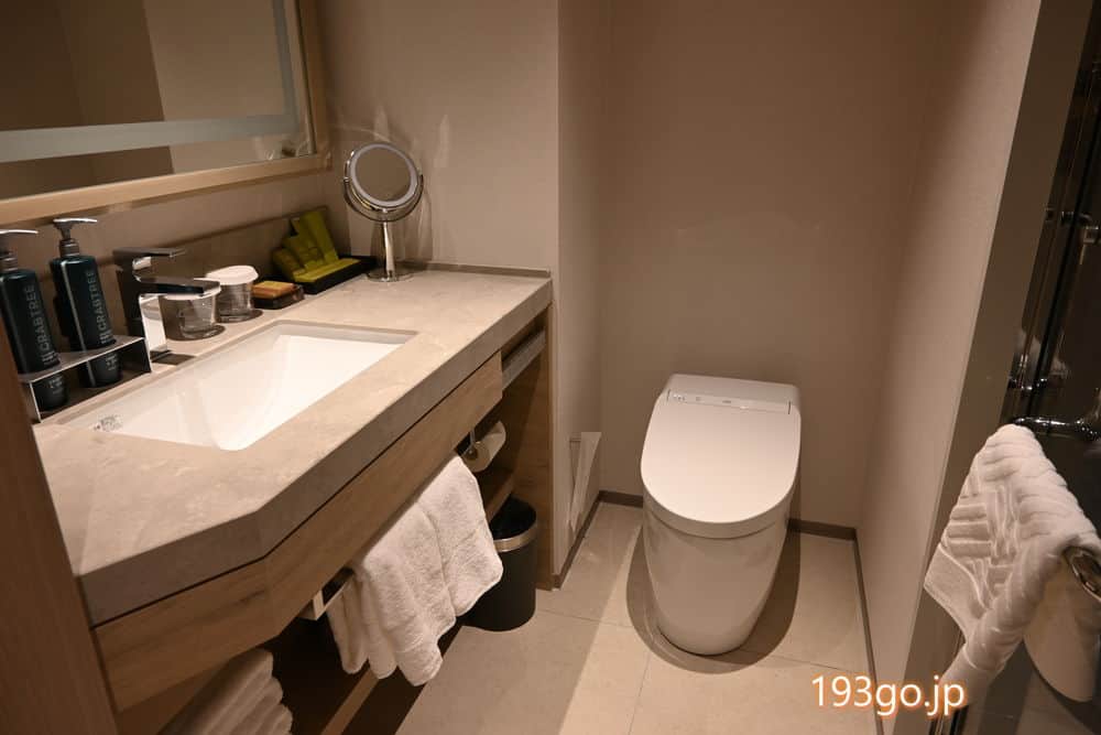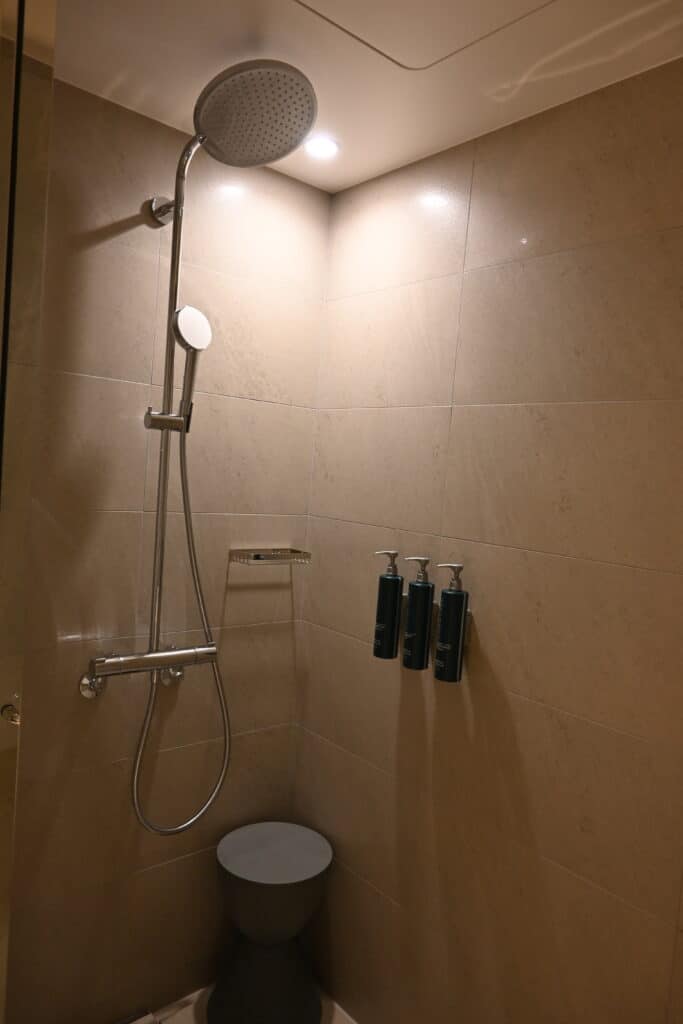洗面台とトイレは一か所にあり、レインシャワーとハンドシャワーが備わるシャワールームも十分な広さ。鏡が大きくていいね、照明付き卓上ミラーも便利。