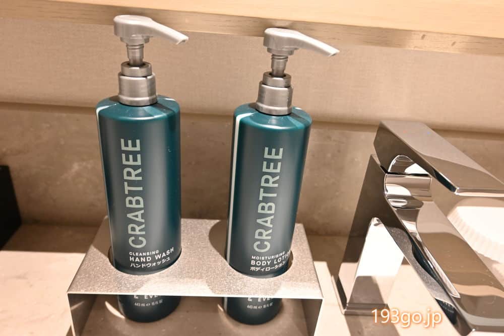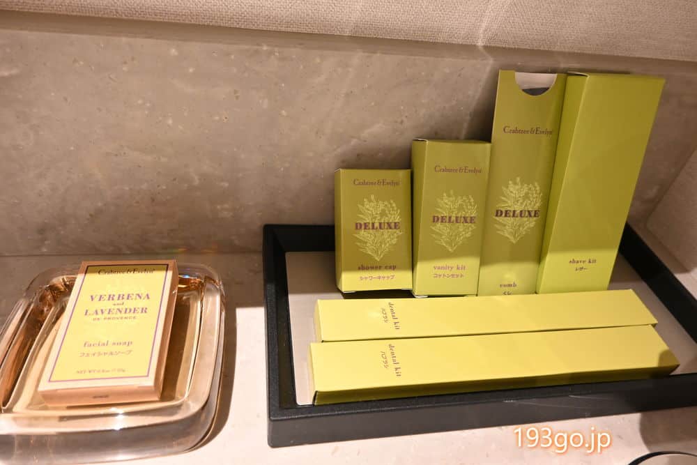 アメニティはクラブツリー&イヴリン歯ブラシ、ヘアブラシ、コットン&綿棒、フェイシャルソープ。