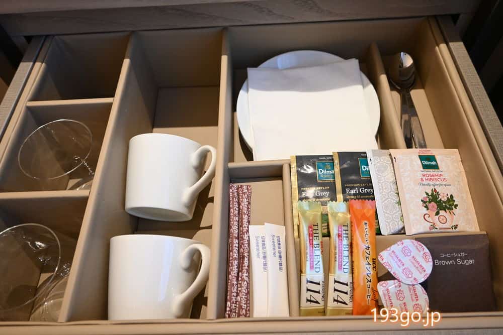 電子ケトルとお水用のピッチャー、ティーバッグ、カップ&ソーサー、グラス。