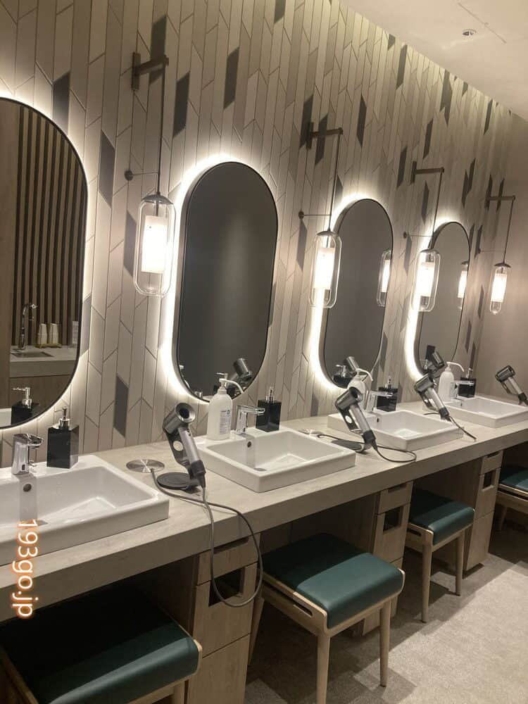 部屋が明るくナチュラルな雰囲気なのに対し、大浴場は暗めの間接照明で、黒基調のスタイリッシュな空間。桶などは木で和も感じられる。