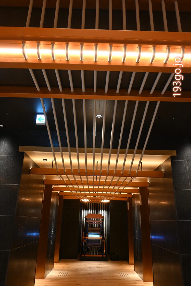 京都の織物をテーマにしたロビーは、エレベーターホールに設置された織機からつながるような美しい格子の吹き抜け空間。また、茶室をイメージし、仙台から取り寄せた伊達冠石が置かれている。