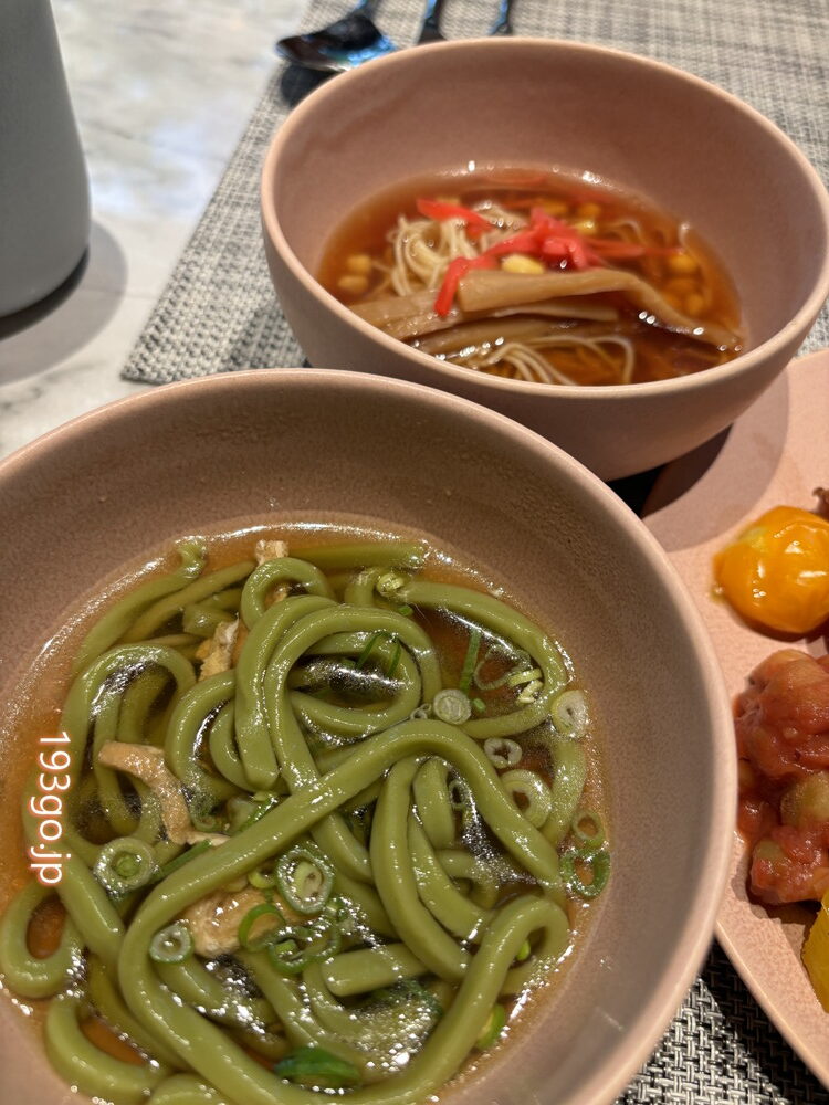 和食には、ちらし寿司や炊き込みご飯、味噌汁、焼き魚、くみあげ湯葉、青しそ豆腐、真丈などが並んでいた。