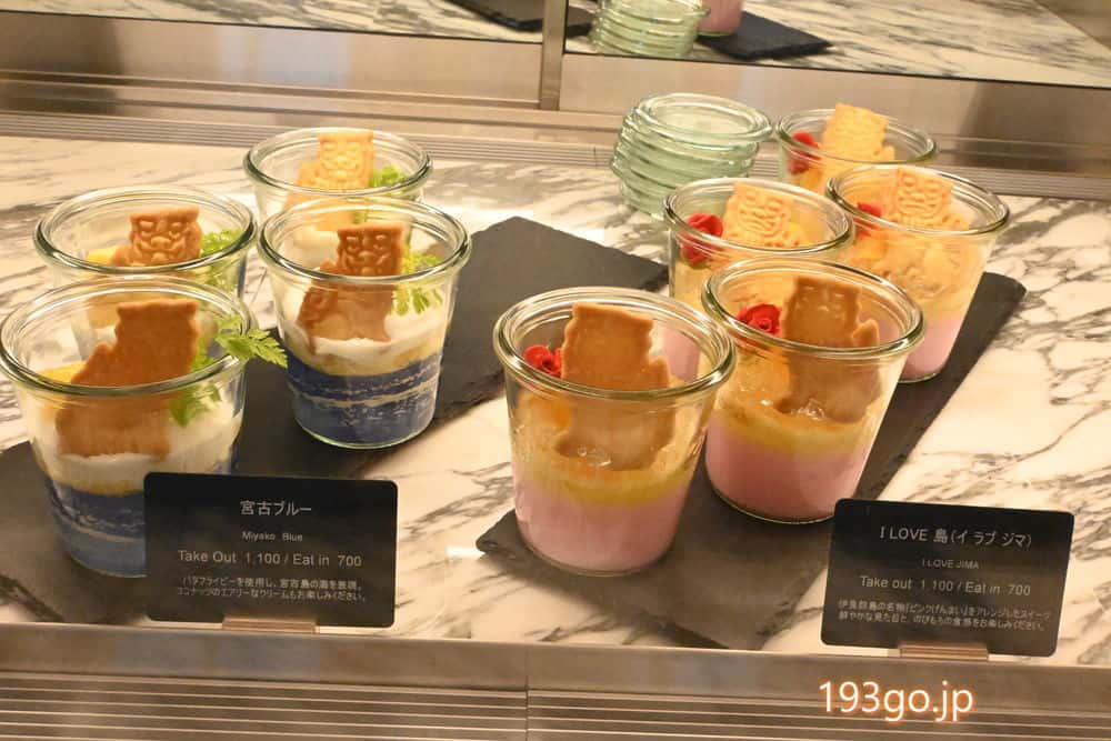 シーサーのクッキーが乗ったケーキは、宮古島の海を思わせる涼し気なブルーのジュレに、フワフワのスポンジとクリーム。トロピカルフルーツと共に。