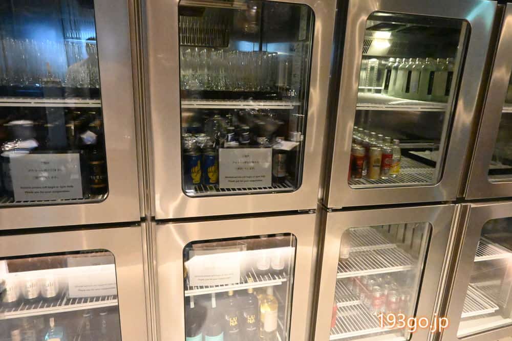 冷蔵庫には、富士ミネラルウォーター (FUJI)とスミス スプリング ウォーター (SMITH)のそれぞれガスあり、ガスなし、ウィルキンソン、横浜クラフトコーラ(ゴールドハート-Gold heart)、コカコーラに、クランベリージュースと、多種類。