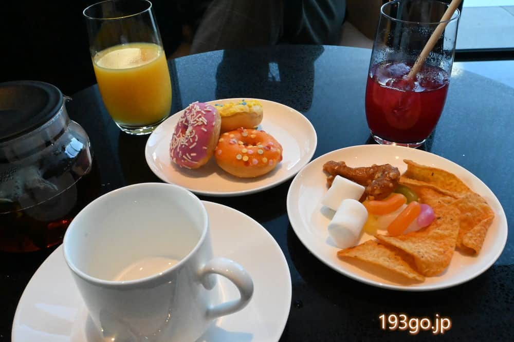ティータイムには、カラフルなミニドーナツ、ドリトス、マシュマロ、かりんとう、グミなど甘いものが中心。