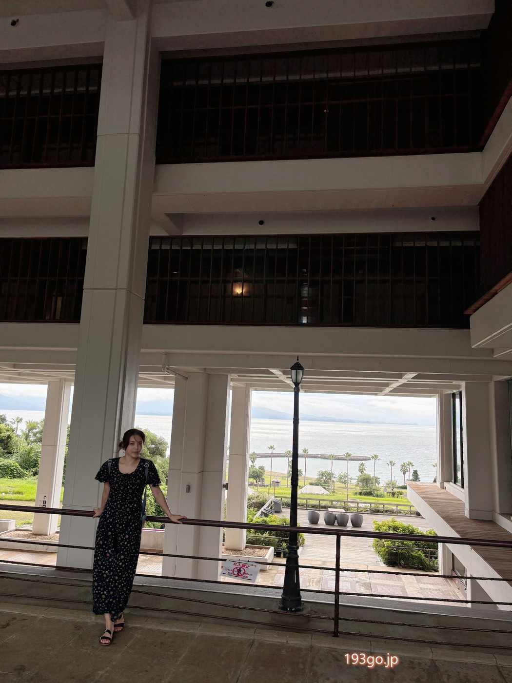 入口を入ると3階フロントロビーへ続き、高い天井と窓の外にヤシの木が揺れるリゾート雰囲気。