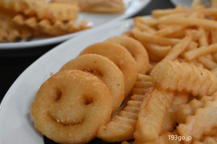 お皿にフライドポテト山盛り!ワッフル、カリカリ、ナミナミ、スマイル
