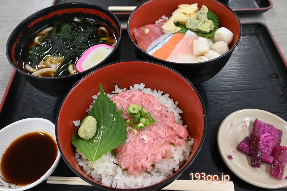 ねぎとろ満腹セットは、ねぎとろが乗った丼と、ベビーホタテやサーモン、マグロ、イカなどのお刺身が乗った海鮮丼に、わかめうどんのセット。