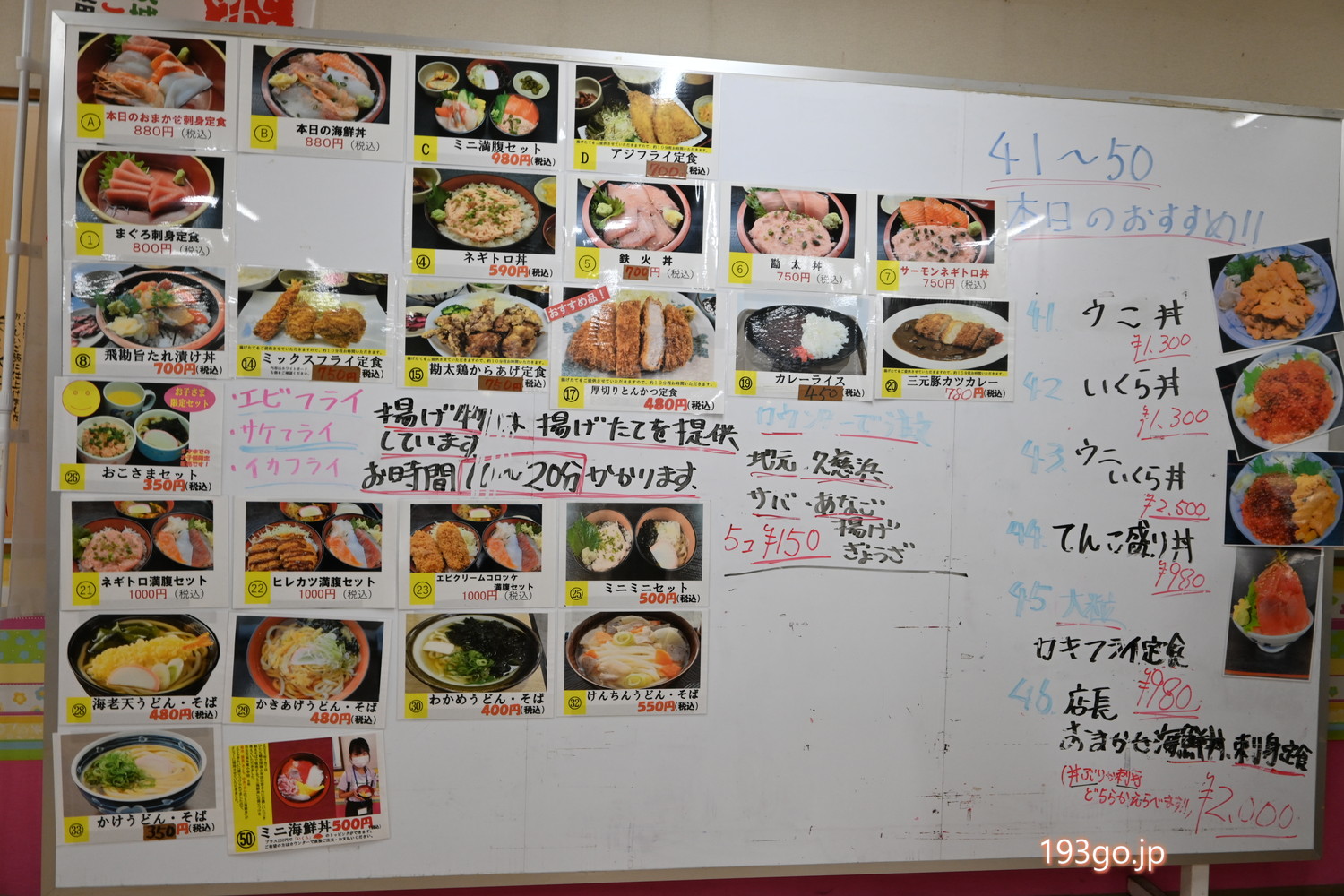 ホワイトボードに写真付きでメニューが貼られ、券売機で食券を購入。