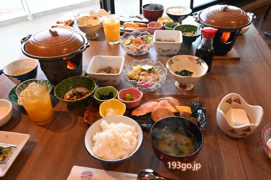 鮭や玉子焼き、サラダ、ヨーグルト、小鉢も沢山ついて彩り豊かでバランスの取れた和食。