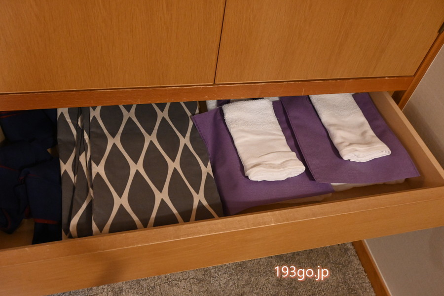 お茶菓子とお茶、ポット、冷蔵庫、セーフティーボックスなどが完備。