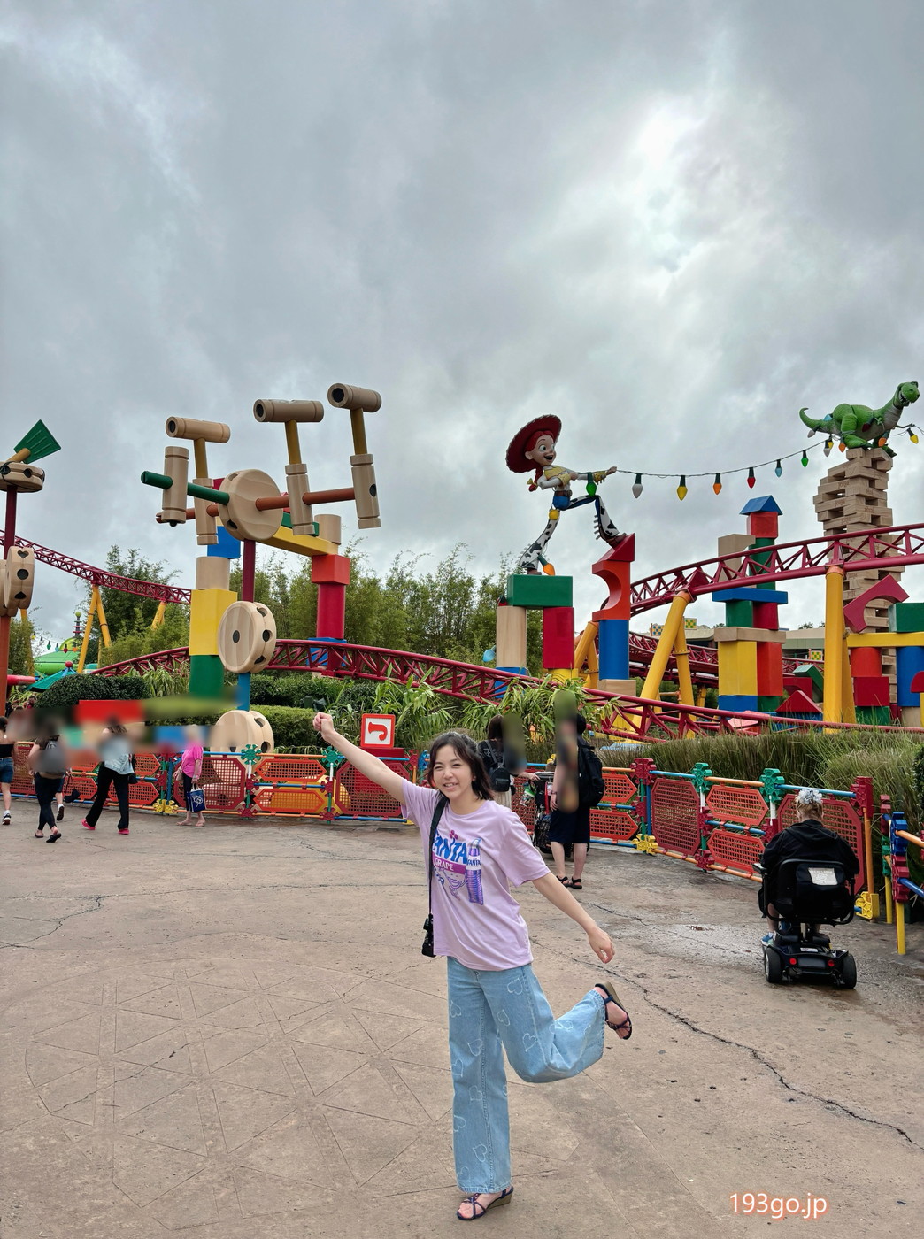 トイ・ストーリーの世界が再現された景観、そしてウッディやバズ・ライトイヤー、ジェシーなどの人気キャラクターにも会える。キッズにも大人気。