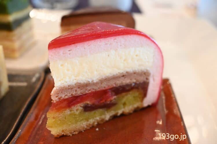 ふわふわ&なめらかで口の中でトロけていく。優しい甘さのいちごのムースにフランボワーズの酸味、白ワインムースや赤ワインのビスキュイ、クレームダマンドなどの層。ムース部分が厚くて、フワシュワの口どけはクセになりそう。