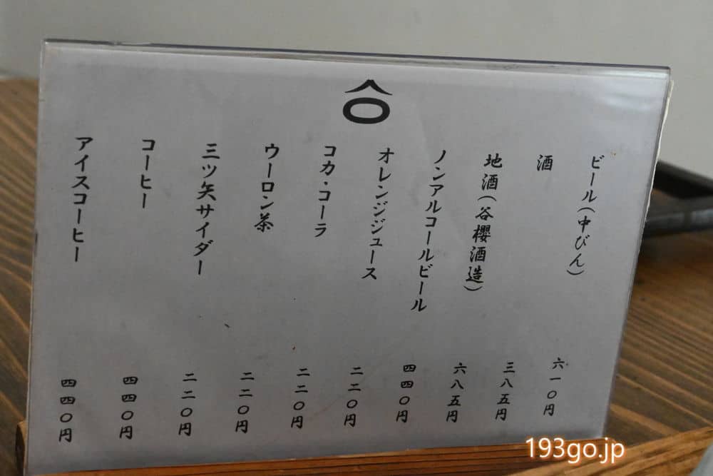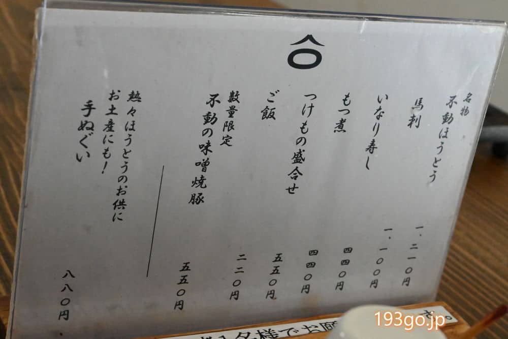 サイドメニューは、馬刺し、もつ煮、いなり寿司、不動の味噌焼き豚。