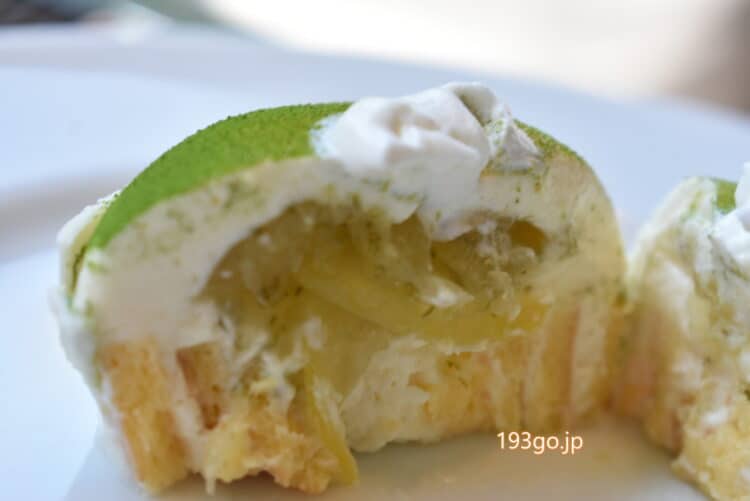 シークァーサーに見立てた季節のケーキ「ヒラミレモン」は、土台はシークァーサークリームのロールケーキで、今が旬の沖縄県産のシークァーサーとグレープフルーツのムースの中にはグレープフルーツの果肉入りゼリー!