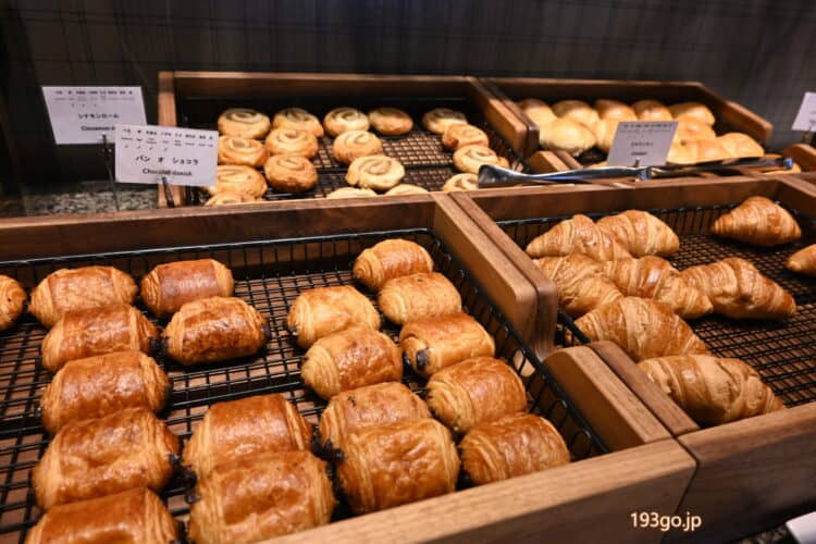 パンは、パンオショコラにクロワッサン、シナモンロール、ミルクパン、バターロール、食パン。