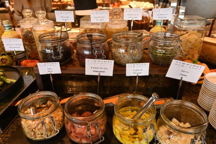 サラダには、ドライレーズンやクリスピーベーコン、チェダーチーズなど沢山トッピングして。