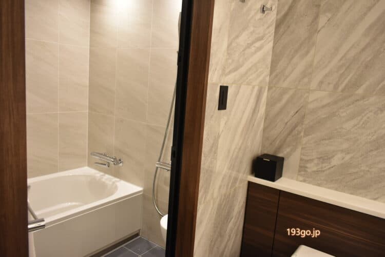 部屋は、リビングルームとベッドルームに分かれ、バスルーム(バスタブ付き)、トイレ、洗面所も2か所に。
