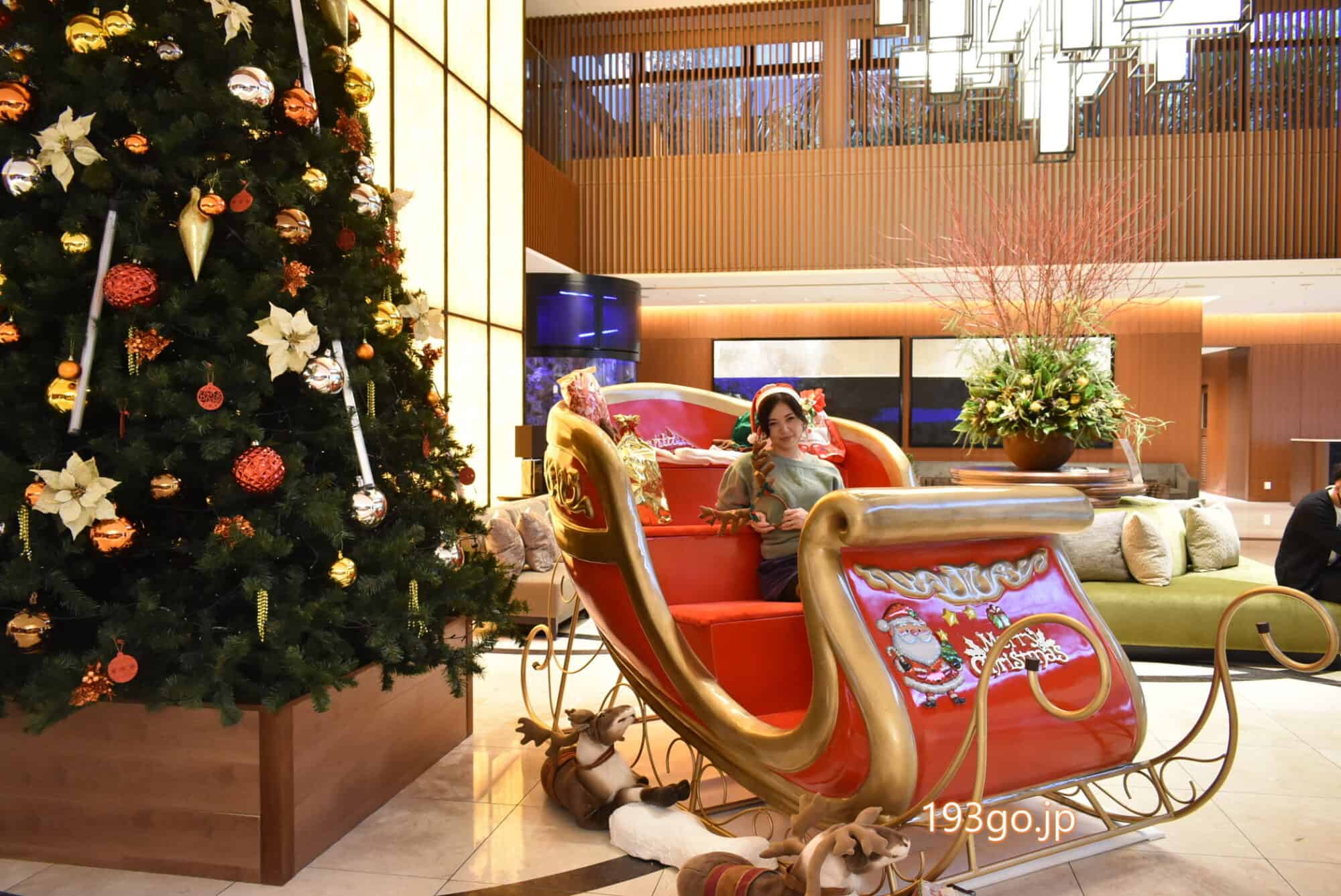 大きなクリスマスツリーの横には真っ赤なソリが置かれ、実際に乗ることが出来る。