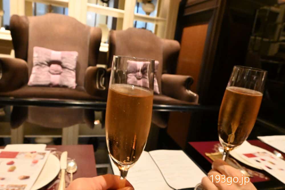 ウェルカムドリンクのロゼスパークリングワインが注がれると、