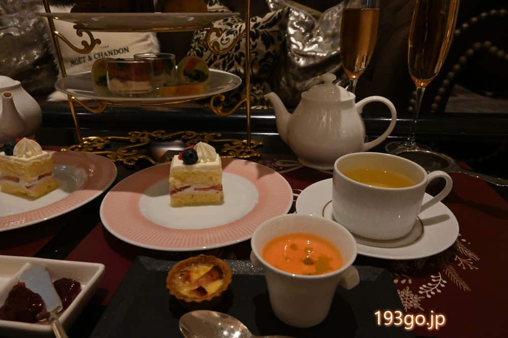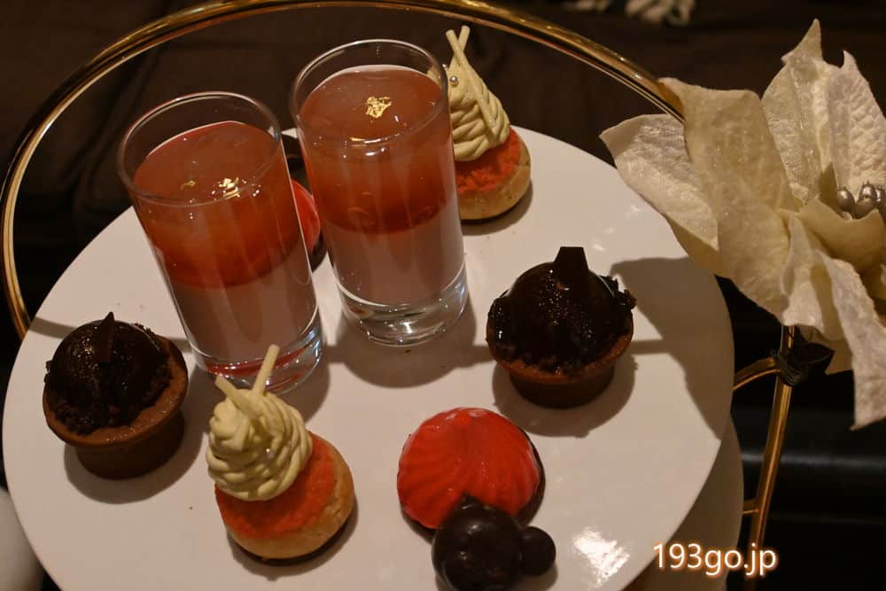 【内容】 乾杯酒(ロゼスパークリングワイン)、プティガトー6種、スコーン2種、セイボリー5種