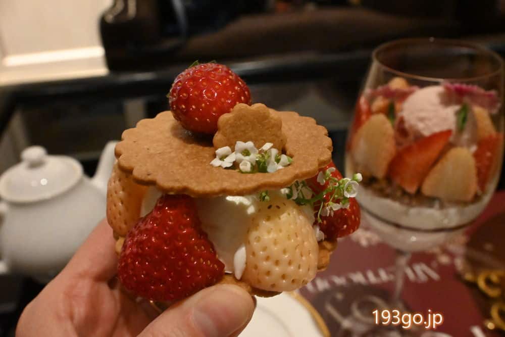 グラスのトップには、白いちごとあまおうとふわふわの食感のクレームダンジュを乗せたクッキー生地のシュクレ。