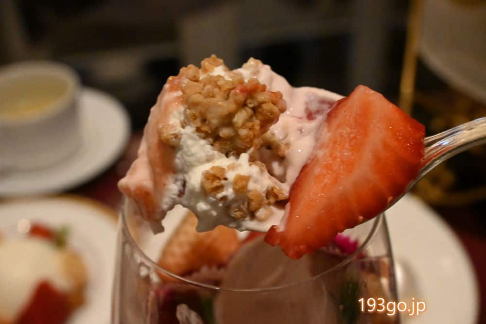 グラスの中には、ほどよい甘さでなめらかな口どけの苺のパンナコッタに、イチジクのコンフィチュール、バニラのシャンティ、サクサクの食感のクランブル、苺の果肉も楽しめるアイスクリーム。