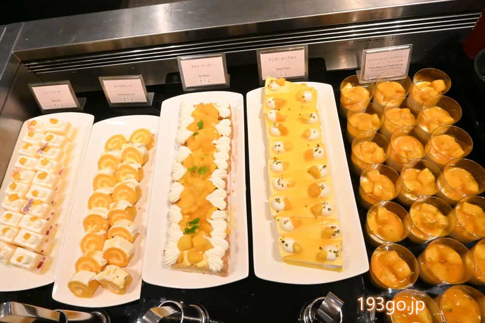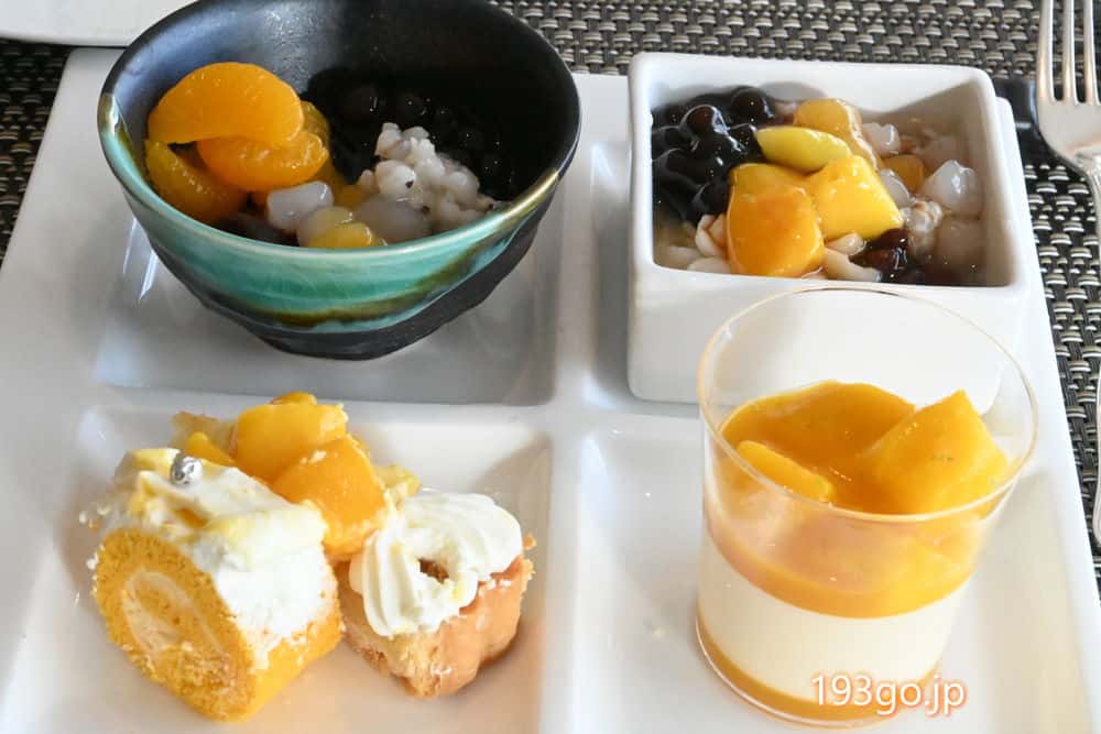 他にもデザートのコーナーには、マンゴーヨーグルトやタルトマンゴー、オレンジロールケーキなど、台湾らしい鮮やかなスイーツ。
