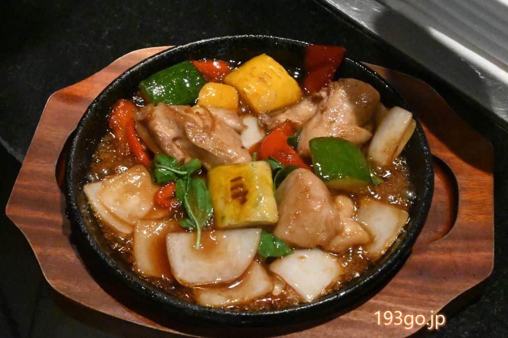 台湾の定番家庭料理「三杯鶏(サンペイジー)」は、柔らかチキンとパプリカや玉ねぎのアツアツ鉄板料理。