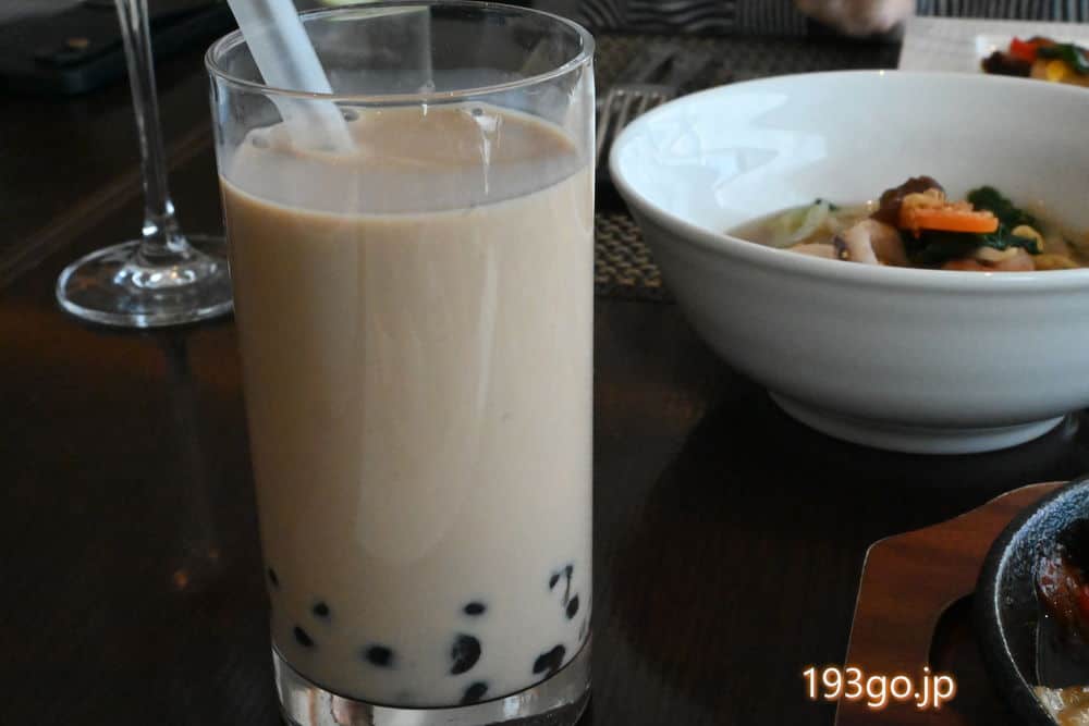 グラスにタピオカ、ロイヤルミルクティーを注いで、タピオカミルクティーも完成~!