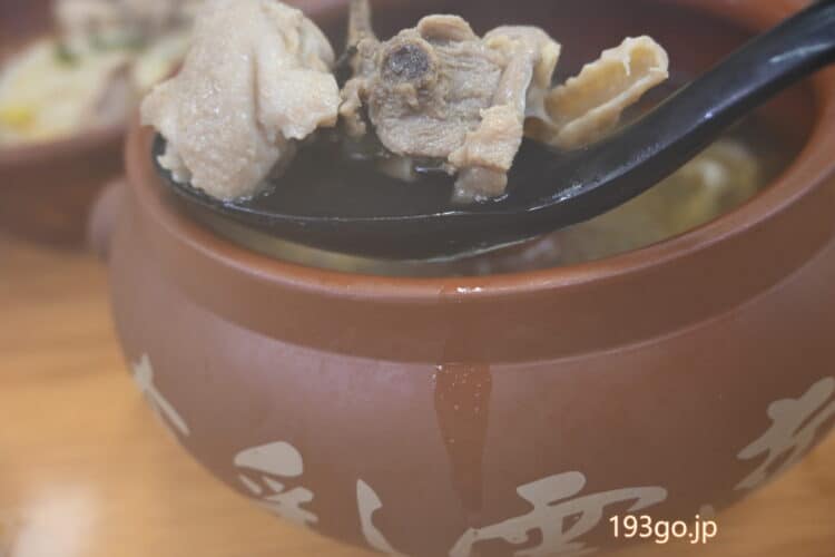 骨付きの鶏肉がゴロゴロ。まずは熱々のスープを。
