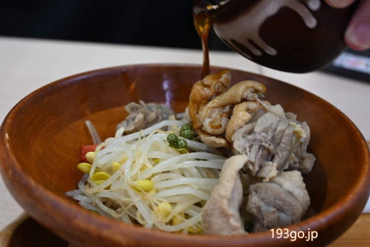 次に、鶏肉をモヤシの丼に乗せて、青山椒醤油をかけていただく。