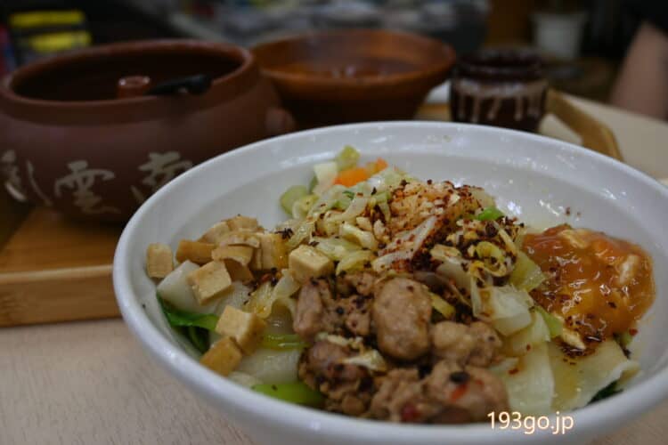 ビャンビャン麺メニューは、3種類ほどあり「三合一(サンハーイー)」を注文。丼にキャベツや角切り野菜、お肉もゴロゴロでかなり具だくさん。