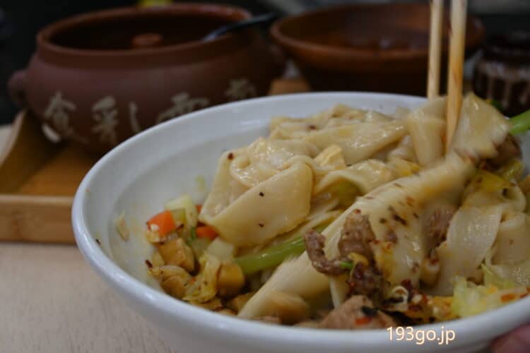 平たくて太い、ツルっとモチモチした食感は刀削麺にも似ている。