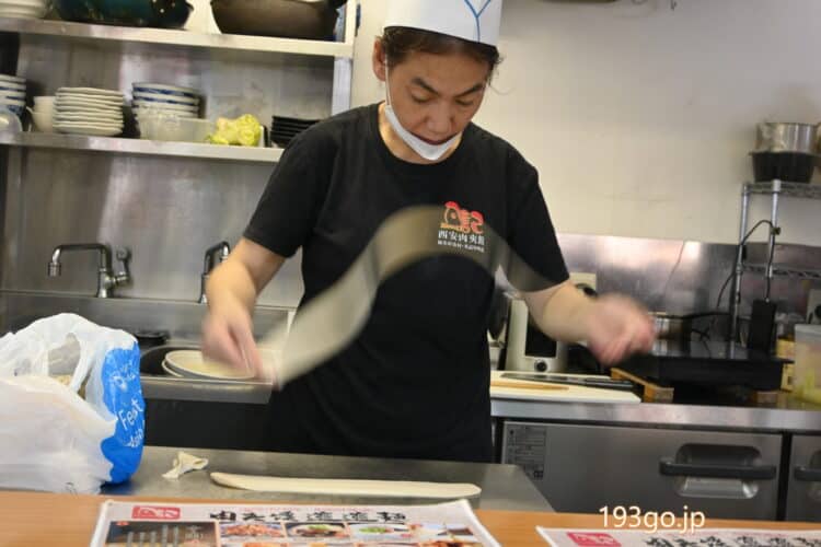 刀削麺は沸騰した鍋に麺を削り入れるのに対し、ビャンビャン麺は、麺を両手で打ち伸ばすのが特徴。