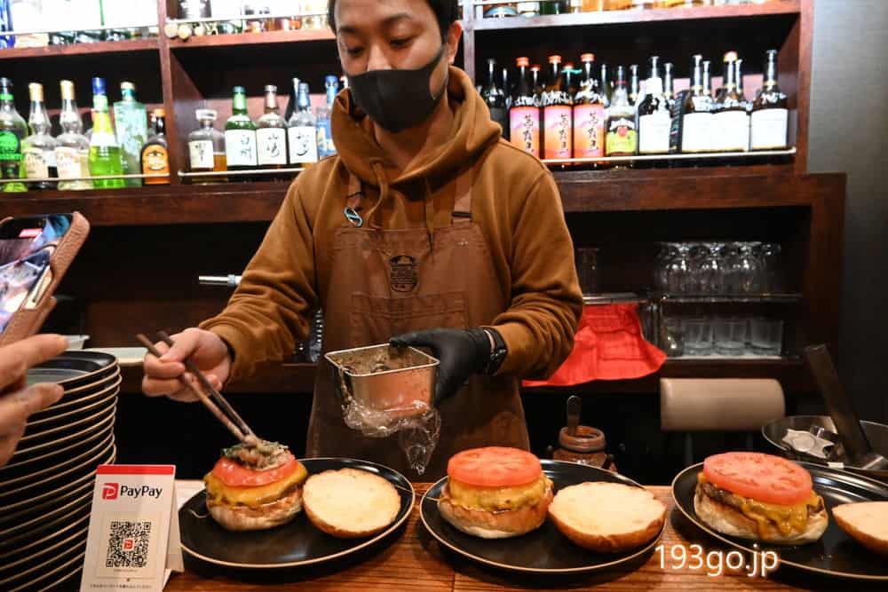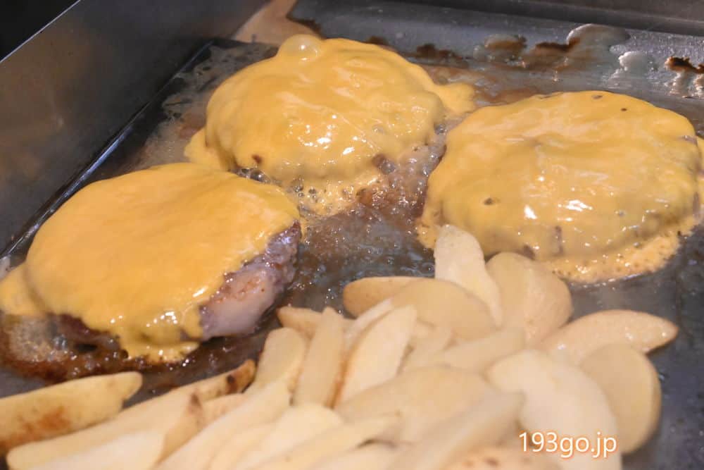 目の前でパティやポテトをグリル。
