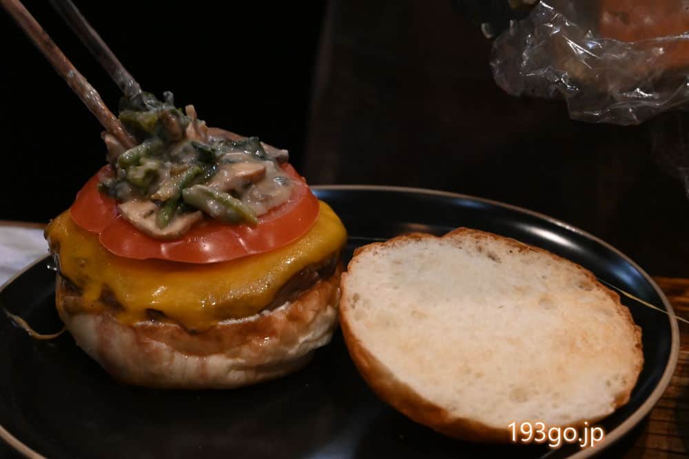 チーズやソース、食材を重ねバンズでサンド。