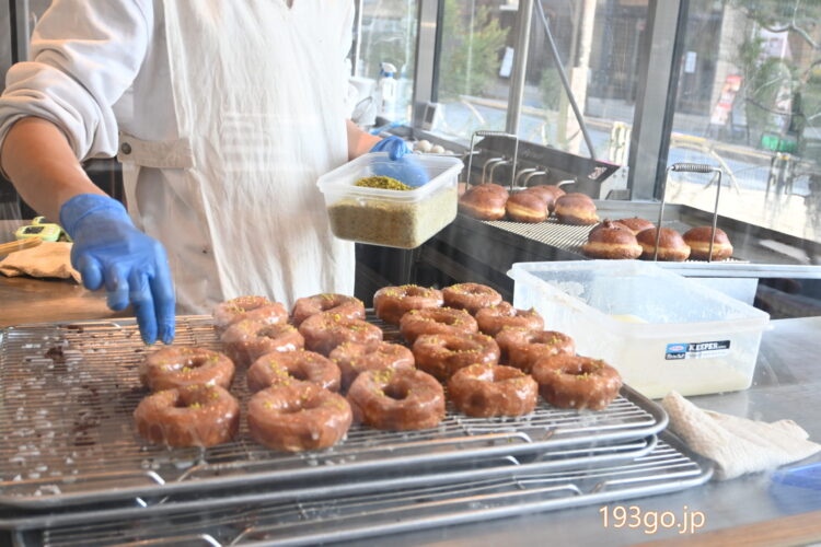 ガラス越しにドーナツを揚げて、クリームを詰めるシーンも見れる。