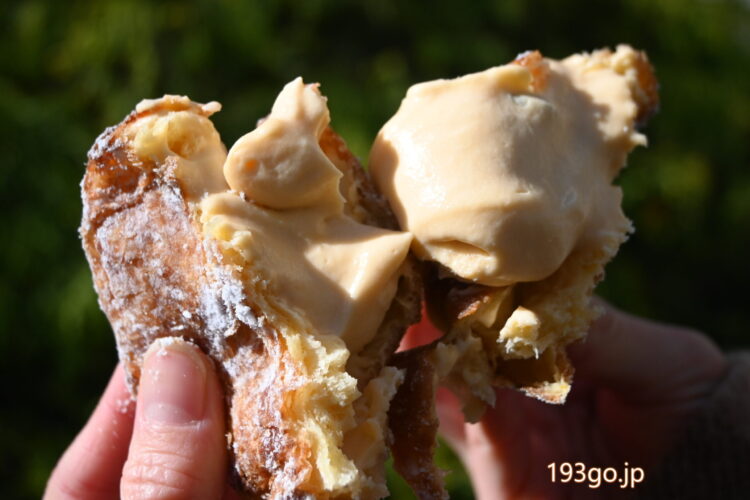 クシュっとした可愛いまん丸ドーナツ。このままカブりつきたいけど、クリームドーナツは半分に割って動画撮影。もっちり弾力ある生地からクリームがとろけ出す。