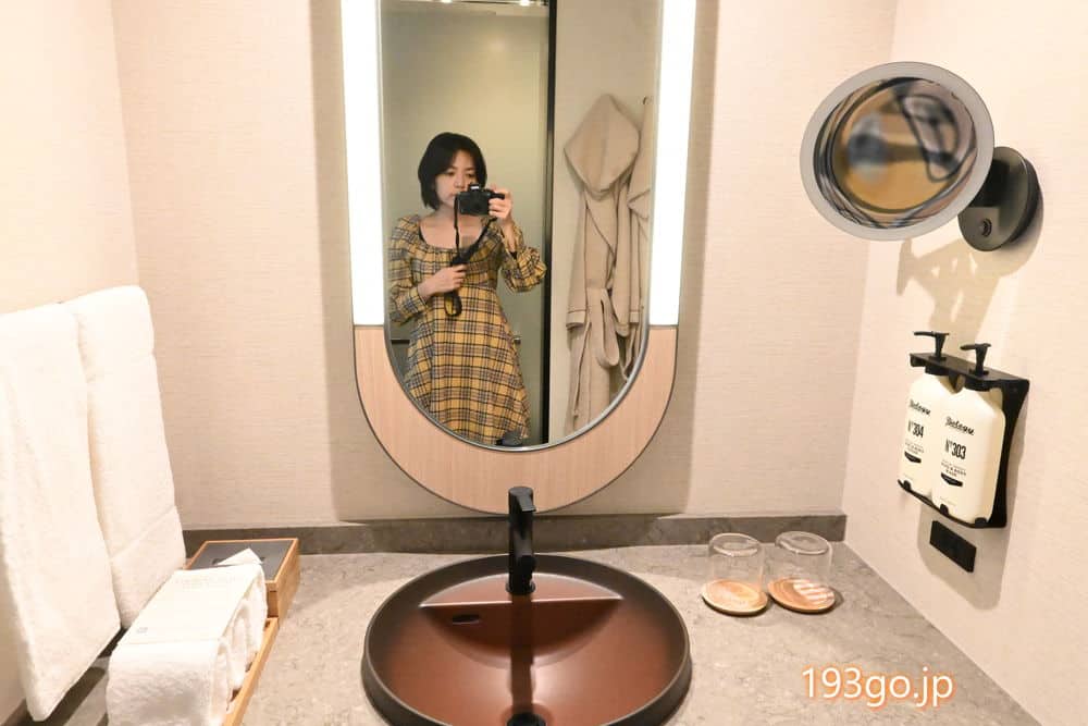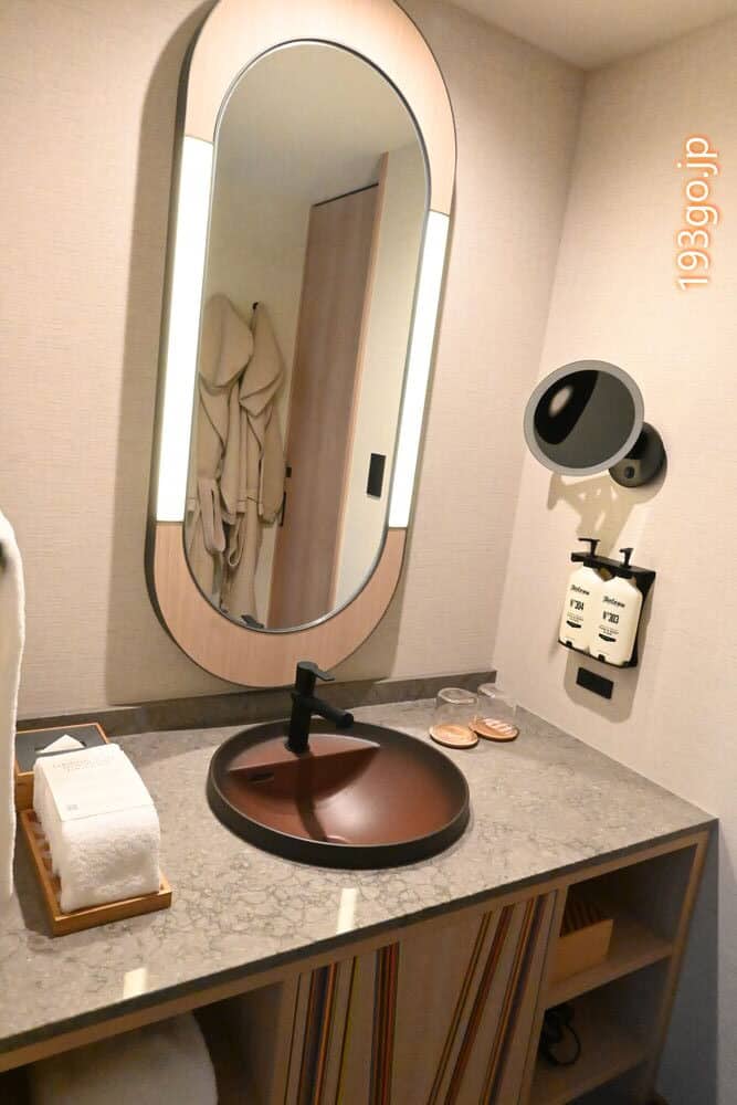 洗面台にはライトが付く大きめのミラーが設置。ほぼ全身が見える!