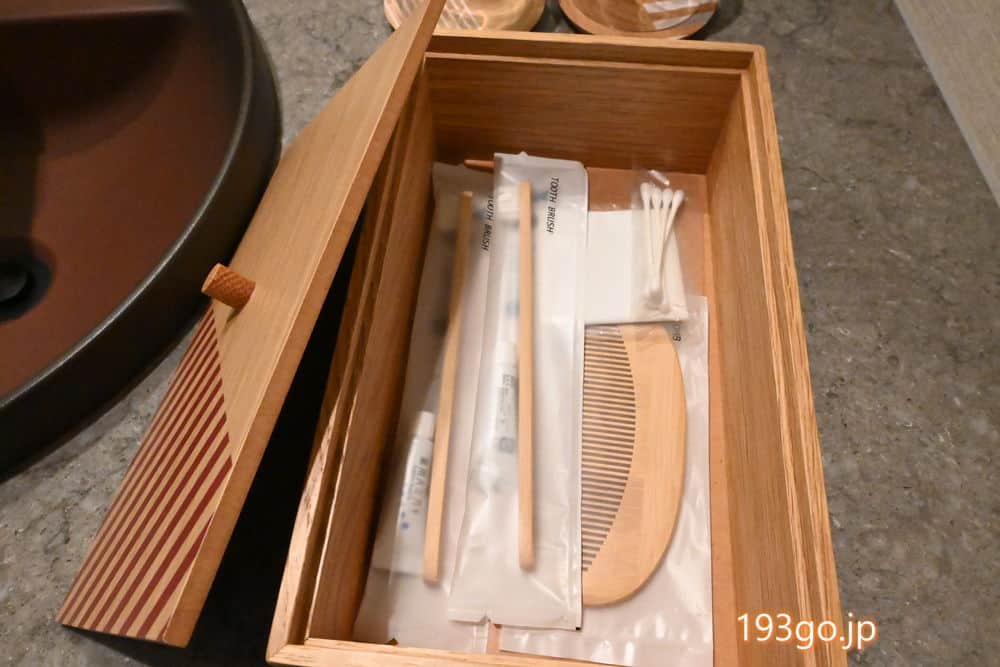 木箱のアメニティボックスに、コットン&綿棒、竹製の歯ブラシとヘアブラシで手ざわりが良い。