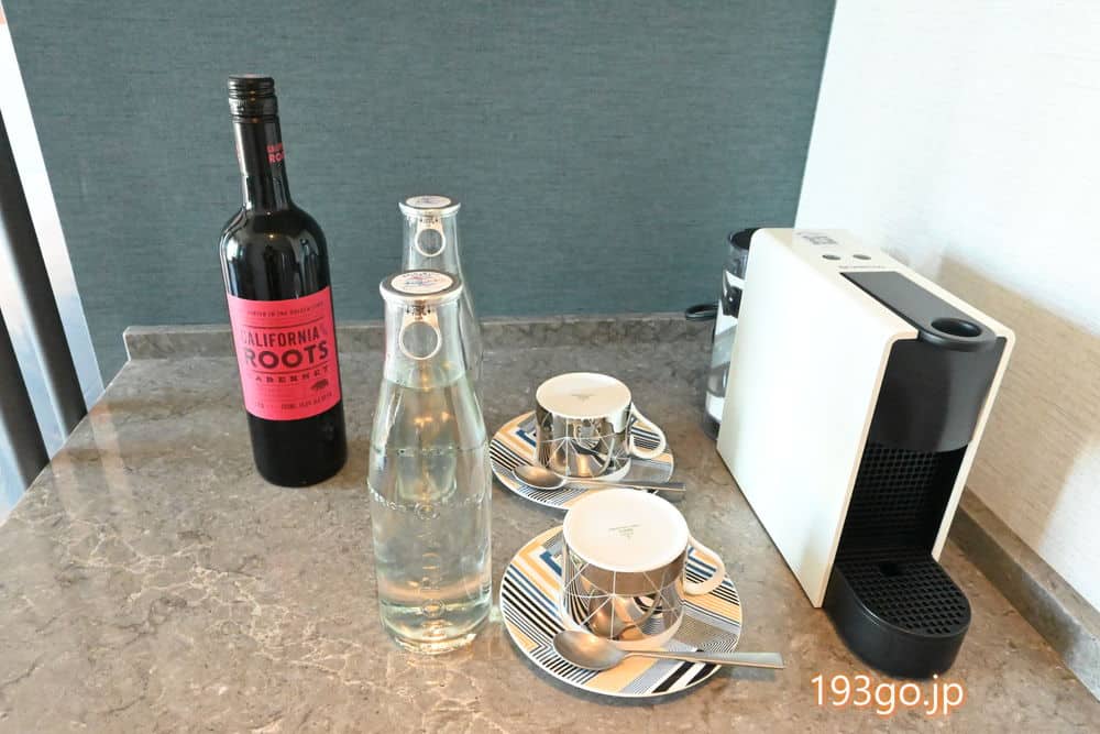 室内アメニティは、ティー&コーヒー、フリーウォーター、コーヒーマシン、バルミューダの電子ケトル、ティーカップ、グラス類が揃う。