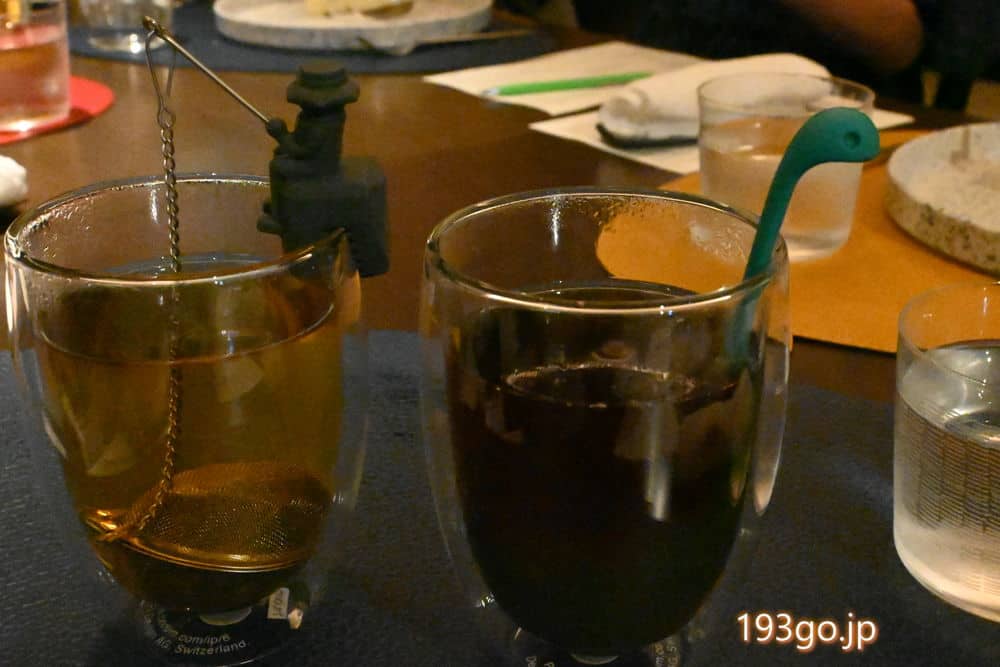 食後に注文した温かいお茶は、釣り竿やネッシーがモチーフとなったティーストレーナー付き。