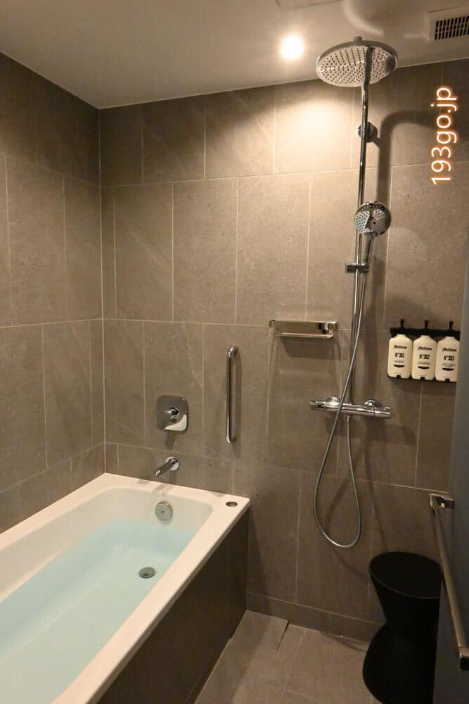バスタブ、レインシャワーとハンドシャワー付きのバスルーム。