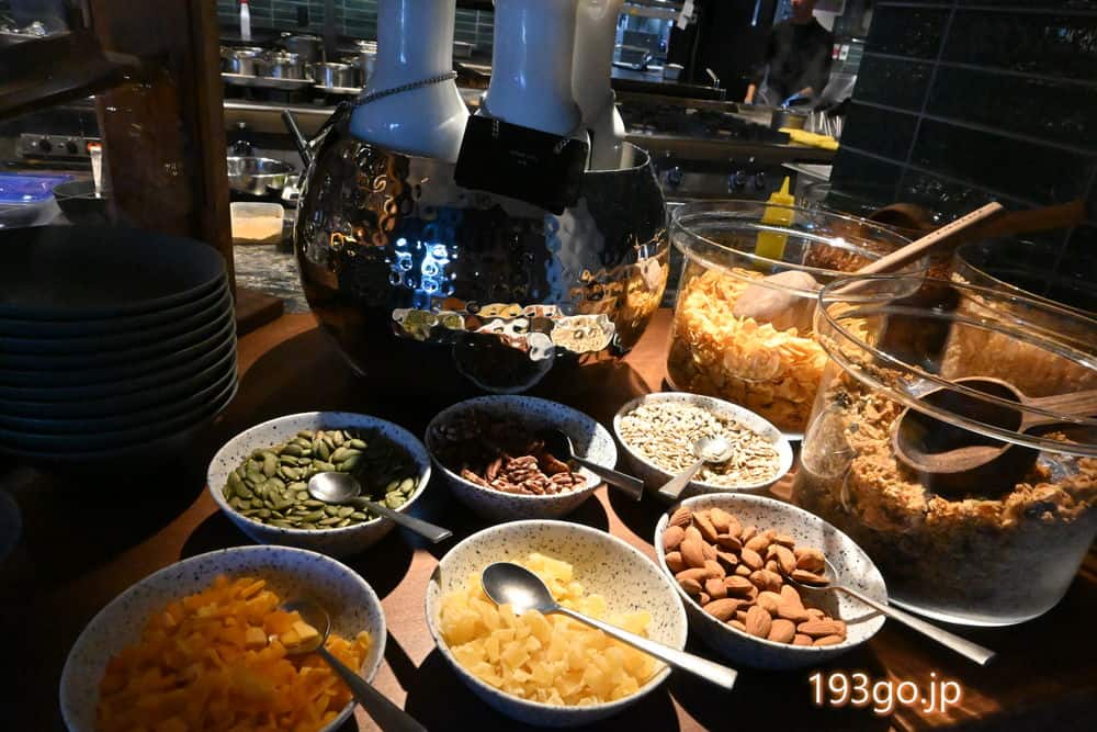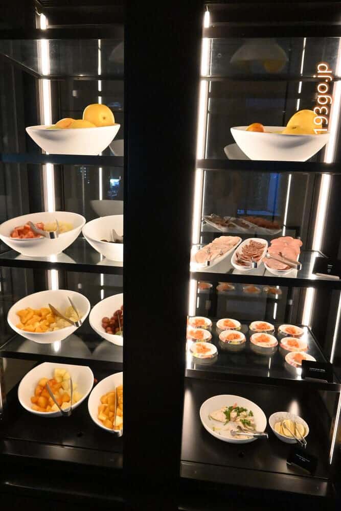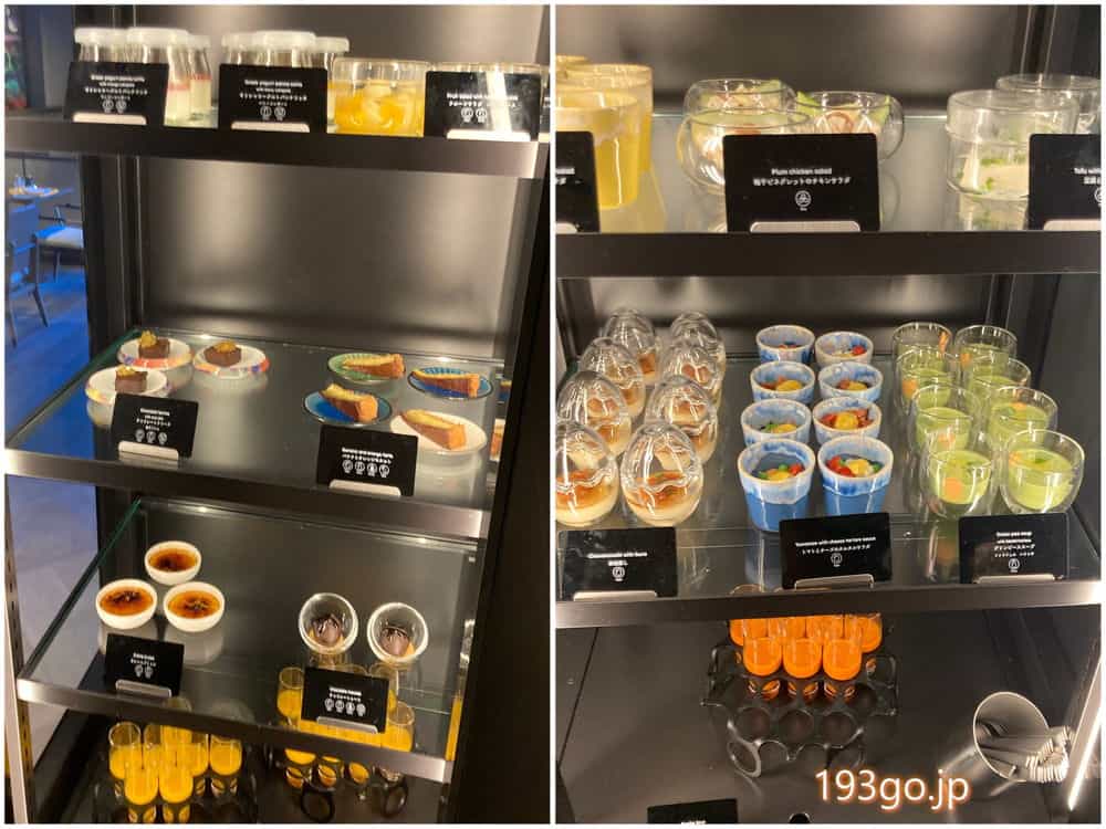 更に冷蔵庫が二カ所に設置され、ハムや茶碗蒸し、スムージー、スープなどの冷製料理や、フルーツ、デザートなど。